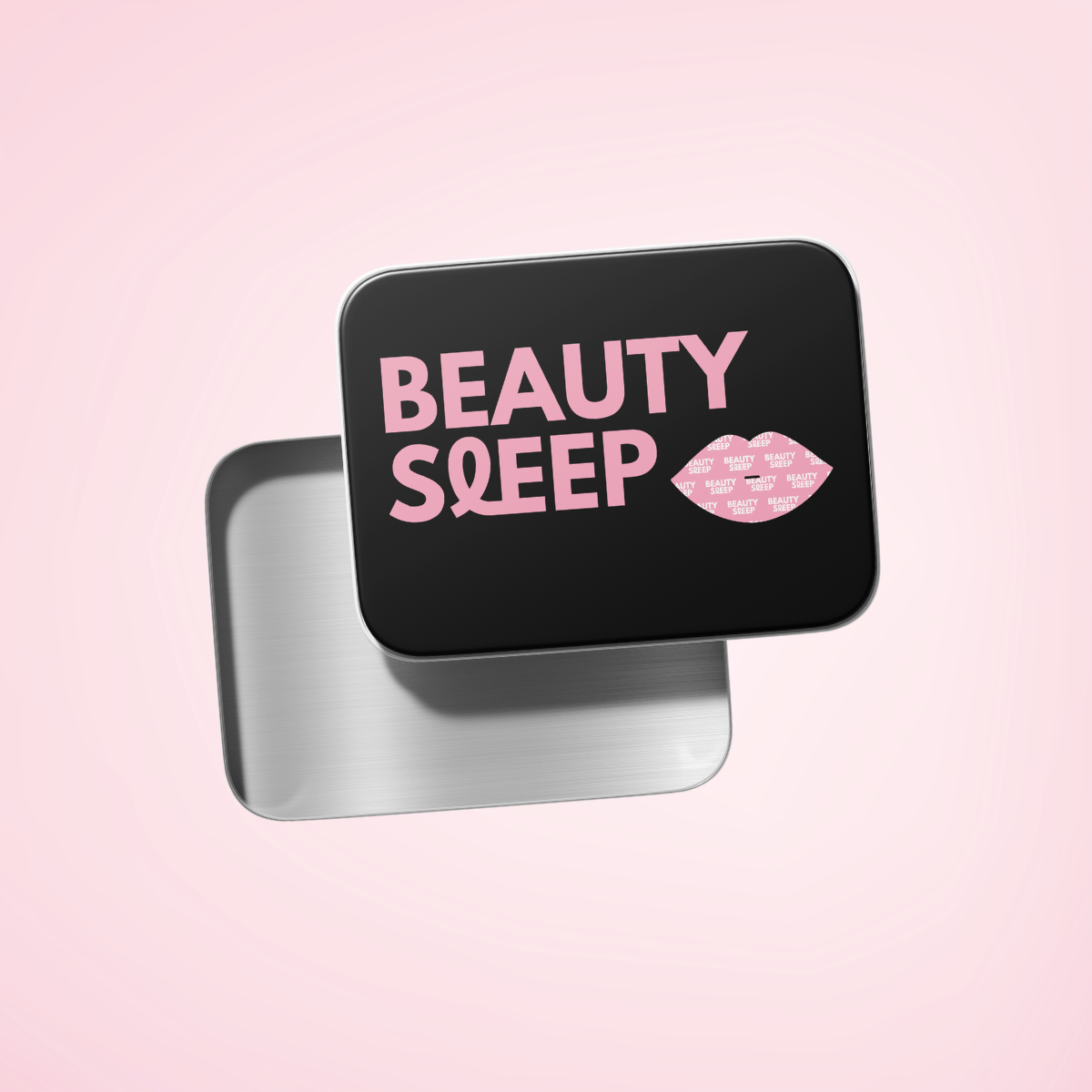 Black tin box with 'Beauty Sleep' text and pink lips design.
